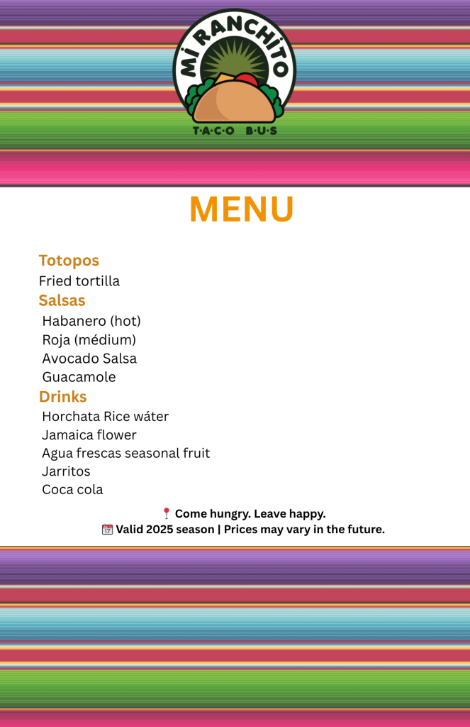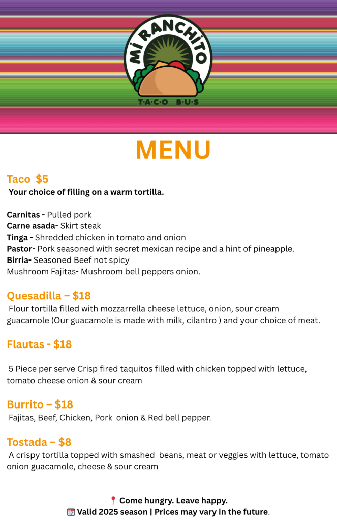 Tortilla de harina blanca o integral, preparada con arroz, frijoles, cebolla, crema agria, salsa de aguacate y carne a elección. Servido con salsa roja o habanero casero.